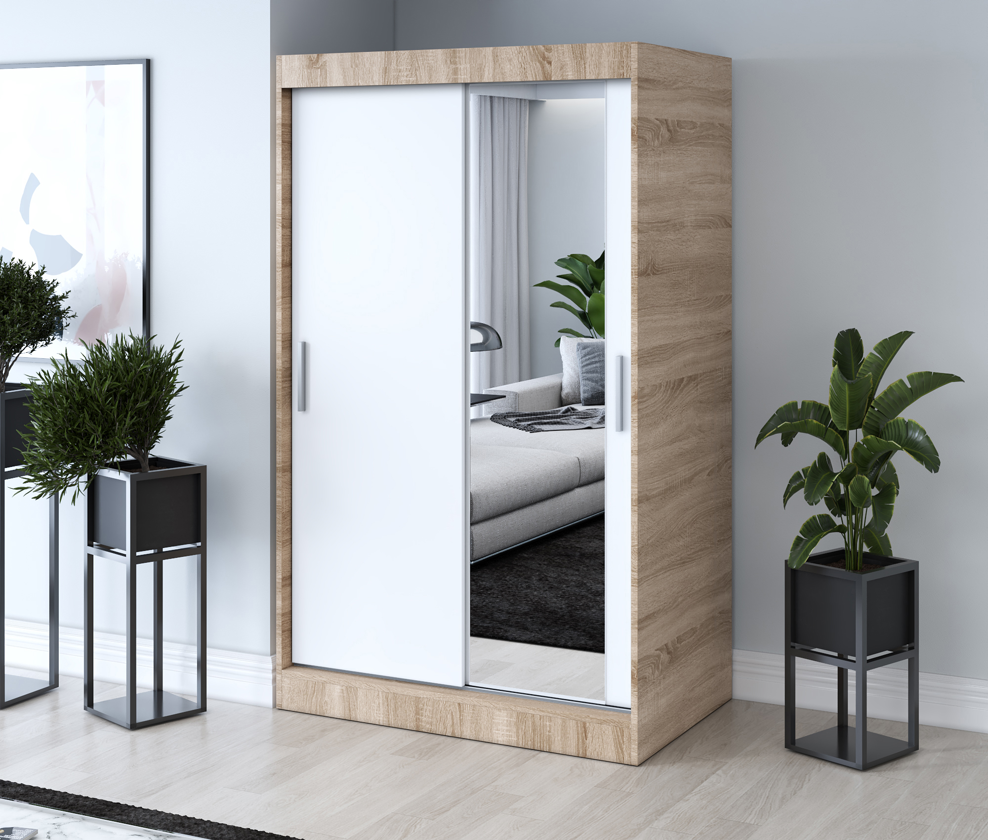 Strona główna > Szafy przesuwne > Szafa przesuwna 1 x lustro 120×200 Hugo , Dąb Sonoma / Biały mat