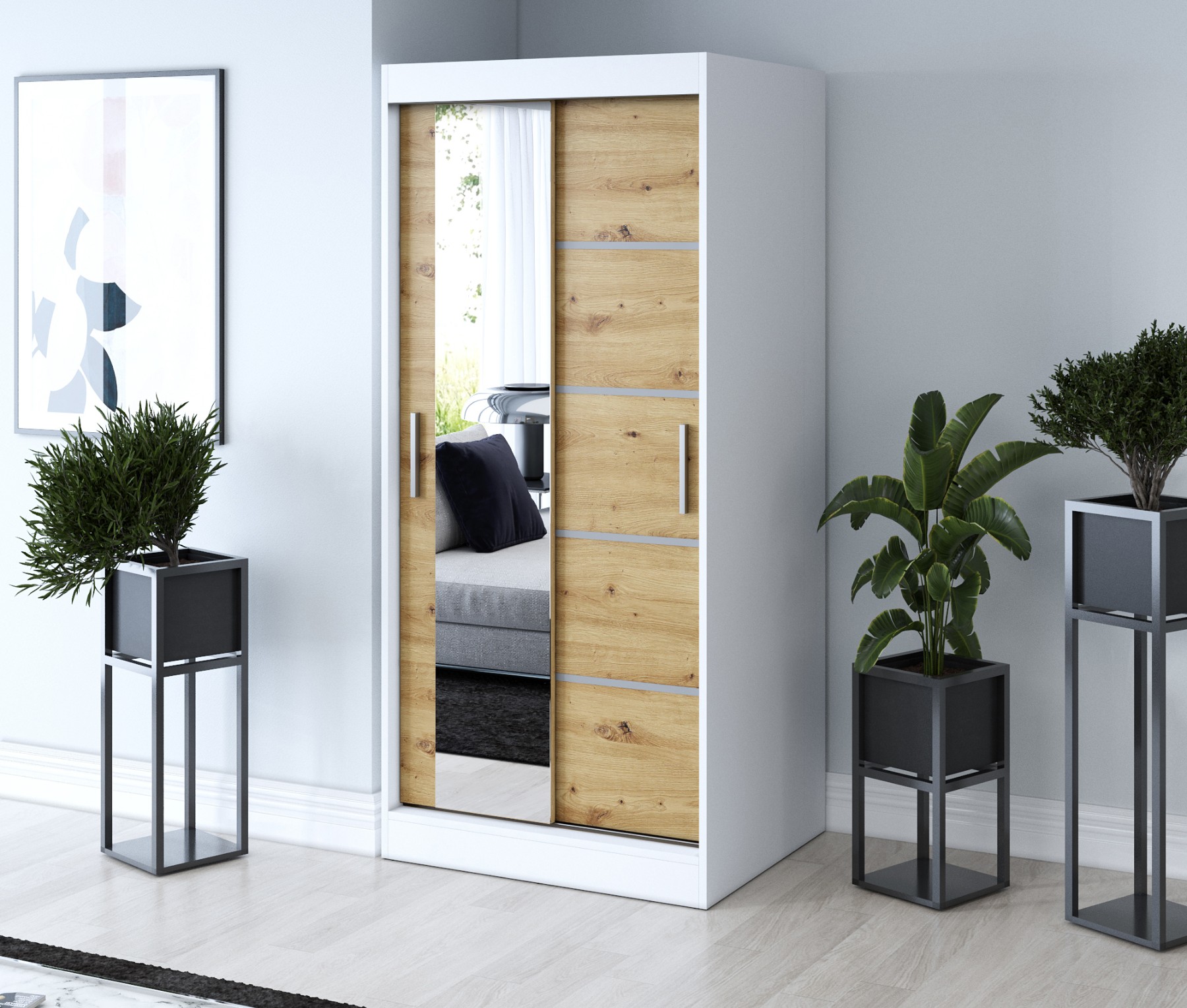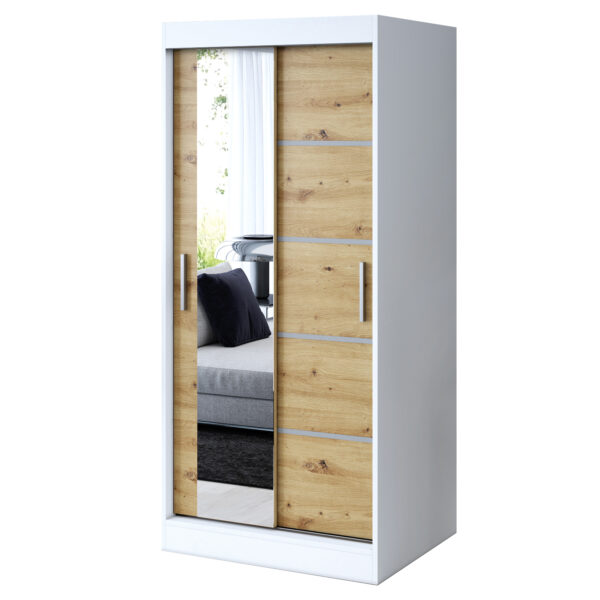 Strona główna > Szafy przesuwne > Szafa przesuwna 1x Lustro 90×200 Ralf, Biały Mat/ Dąb Artisan