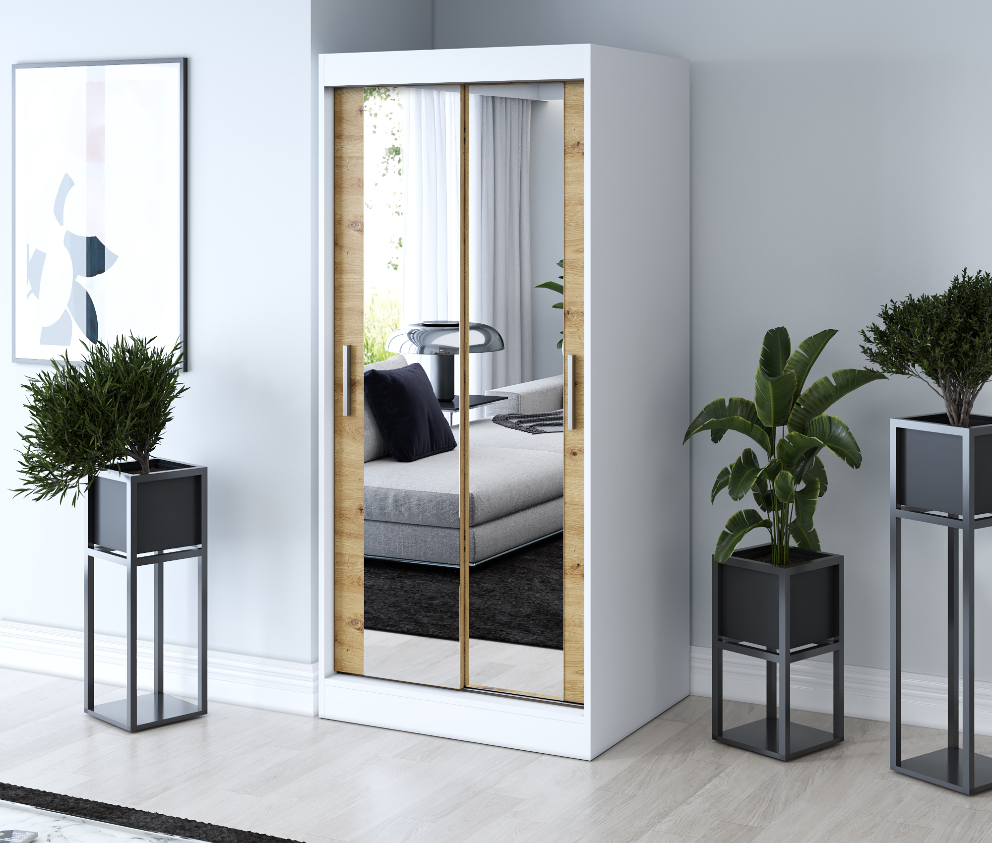 Strona główna > Szafy przesuwne > Szafa przesuwna 2x Lustro 90×200 Karl , Biały mat / Dąb Artisan