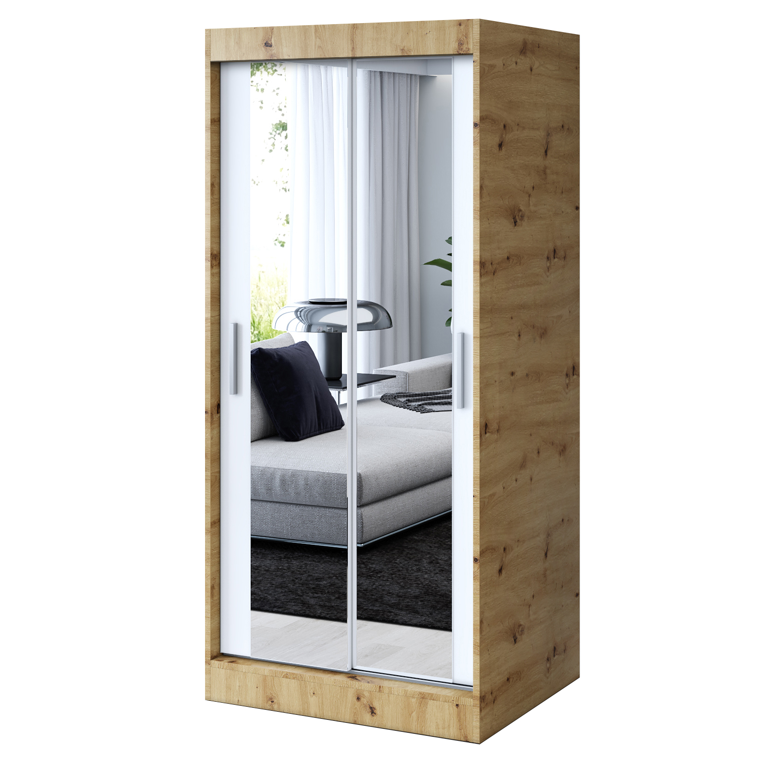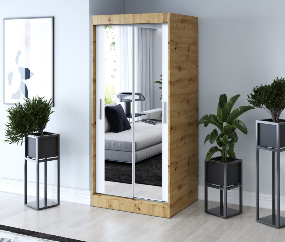 Strona główna > Szafy przesuwne > Szafa przesuwna 2x Lustro 90×200 Karl , Dąb Artisan / Biały mat